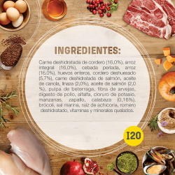 Carne deshidratada de cordero (16,0 %), arroz integral (16,0 %), cebada perlada, arroz (16,0 %), huevos enteros, cordero deshuesado (5,7 %), carne deshidratada de salmón, aceite de canola, linaza (2,0 %), aceite de salmón (2,0 %), pulpa de remolacha, fibra de arvejas, sabor natural a pollo, alfalfa, cloruro de potasio, manzanas, zapallo, calabaza (0,16 %), brócoli, DL-metionina, sal marina, raíz de achicoria, biotina, romero, vitaminas y minerales quelados.