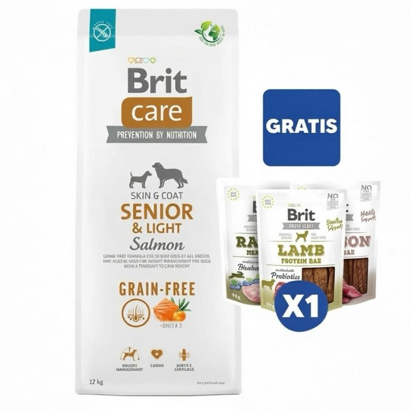 Fórmula libre de granos para perros adulto mayores (a partir de los 7 años) De todas las razas. Ideal también para perros con tendencia a subir de peso. Brit Care Senior & Lights All Breed está adecuadamente balanceado y es altamente digestible. Alimento Super Premium formulado con los requerimientos especiales de los perros mayores. El alimento está enriquecido con selenio orgánico y vitamina E para retrasar el envejecimiento, reducir el riesgo de obesidad, minimizar los potenciales problemas de digestión y ayudar a la protección saludable del organismo.