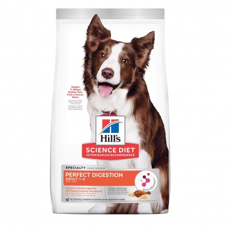 Hill's Science Plan Perfect Digestion alimento para perros adultos de raza mediana con pollo y arroz integral contiene ActivBiome+, la exclusiva combinación de prebióticos de Hill's que ayuda a nutrir y a equilibrar rápidamente el microbioma intestinal específico de cada mascota.