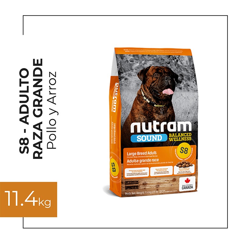 Nutram S8, es una receta pensada para darle a tu mascota un conjunto de beneficios nutricionales que le permitan llevar una vida saludable. Contiene proteína animal como primer ingrediente que proporciona los aminoacidos esenciales para su organismo, la combinación de aceite de salmón y cúrcuma mejoran la movilidad gracias a sus propiedades antiinflamatorias además, la raíz de achicoria y la menta promueven el crecimiento de las bacterias intestinales naturales permitiendo que el sistema digestivo de tu mascota funcione de manera óptima. Tienes a todos los ingredientes de la receta actuando para darle a tu mascota los mayores beneficios de cada uno más las ventajas de su combinación.