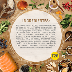 Filete de trucha (15,0 %), carne deshidratada de salmón (15,0 %), carne deshidratada de arenque, arvejas verdes, garbanzos, lentejas, aceite de canola, filete de salmón, sabor natural, aceite de salmón, manzanas, zanahorias, zapallo, quinua, arándanos azules (0,11 %), moras (0,11 %), col rizada, arándanos rojos, algas marinas, raíz de achicoria, biotina, yucca schidigera, mejillón de labios verdes, espinaca, semillas de apio, menta, manzanilla, cúrcuma, jengibre, romero, vitaminas y minerales quelados.