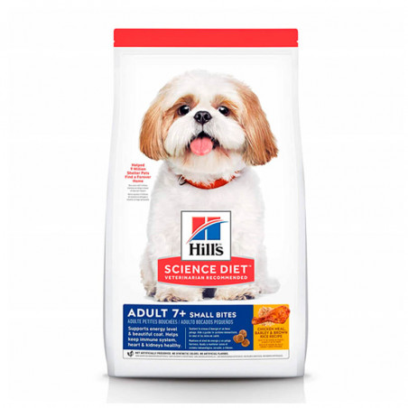 El alimento seco para perros Hill’s Science Diet Adult 7+ Small Bites está específicamente formulado para ayudar a los perros de 7 años o más a mantenerse sanos a medida que envejecen. Este alimento seco para perros mayores está diseñado para perros que prefieren un bocado más pequeño. Aunque la croqueta es pequeña, este alimento Science Diet para perros está repleto de nutrición balanceada. Desarrollado por científicos y nutriólogos de Hill’s, este alimento para perros de 7 años o más está hecho con ingredientes naturales más vitaminas, minerales y aminoácidos, y no contiene colores, sabores o conservadores artificiales. También proporciona una mezcla de antioxidantes clínicamente comprobada para favorecer un sistema inmunológico sano.