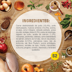 Carne deshidratada de pollo (16,4 %), pollo deshuesado, huevos enteros (10,3 %), avena, arvejas, arroz integral, cebada perlada, grasa de pollo, lentejas, linaza (2,3 %), pulpa de remolacha, digesto de pollo, aceite de salmón (1,2 %), manzanas, zanahorias, calabaza, carne deshidratada de salmón, extracto de tomate, cloruro de potasio, granadas (0,10 %), arándanos rojos, raíz de achicoria, sal, fibra Psylium, yucca schidigera, espinaca, semillas de apio, menta, manzanilla, cúrcuma, jengibre, romero, vitaminas y minerales quelados.